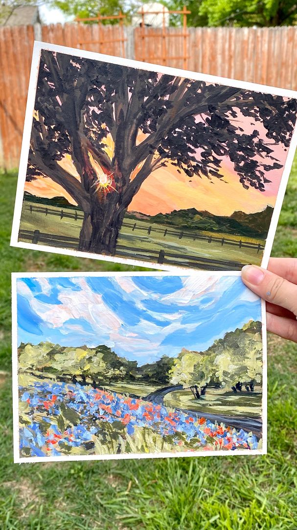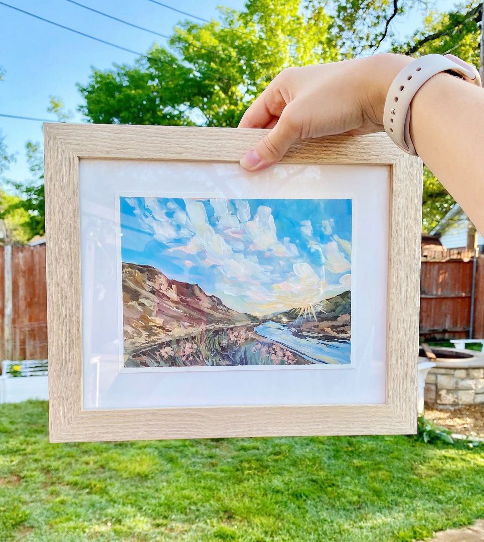 I like to say that my career as an artist came naturally, but that doesn’t mean it has always been easy. I started painting landscapes back in 2020, right after I moved across the country to Texas. I’m a pretty outdoorsy person, so being stuck at home, especially in a new place, was difficult to say the least. I began searching “hikes near me,” and much to my dismay, the results showed our neighborhood park as the best option. Painting one of the places that I missed seemed like the next best thing to do, and I was immediately hooked. This led to me creating my first painting series, and probably the one that I’m best known for and most proud of – I created a landscape painting for each of the 50 states!